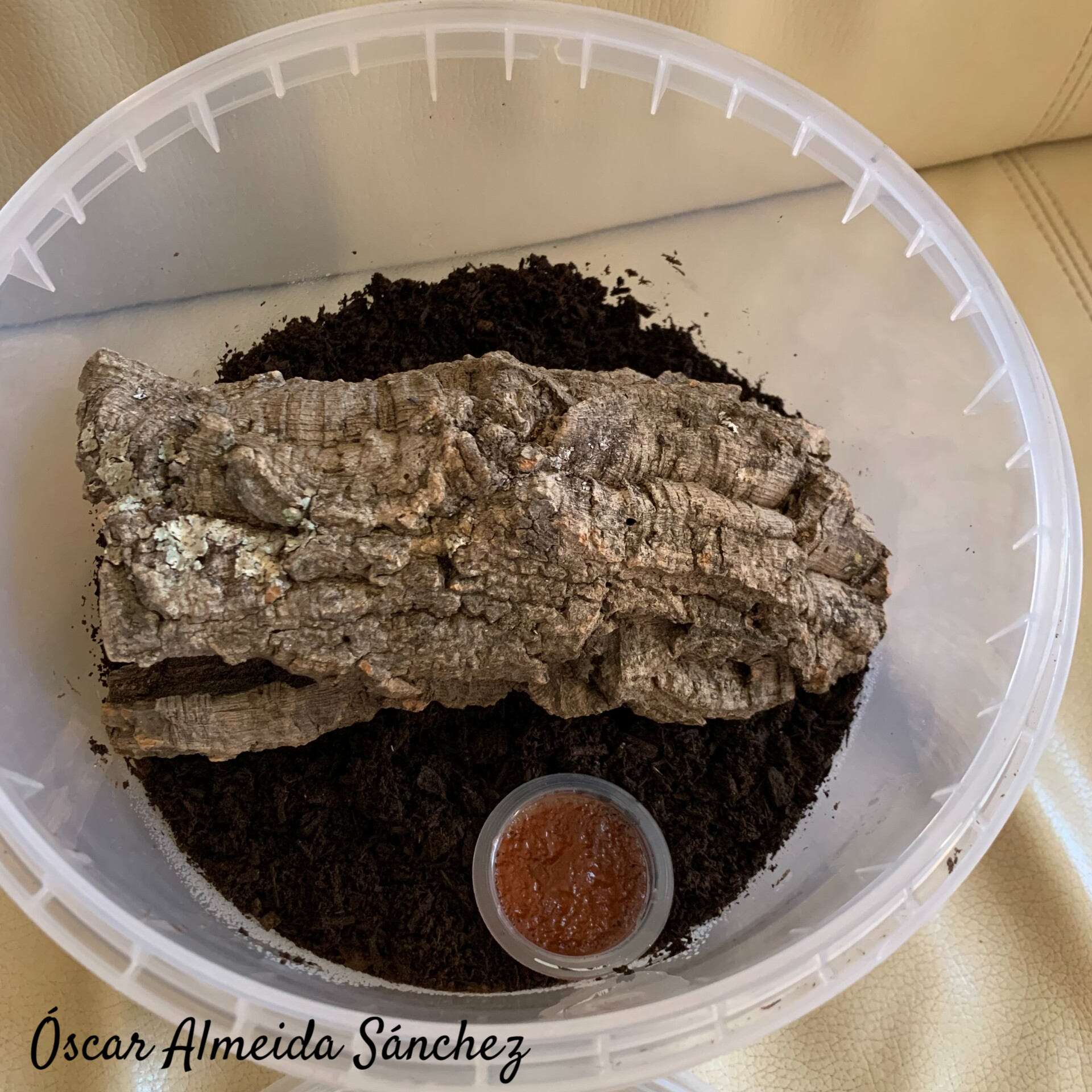Terrario de Dola interior: sustrato de flake soil, tronco de madera hueca y gelatina frutada como alimento