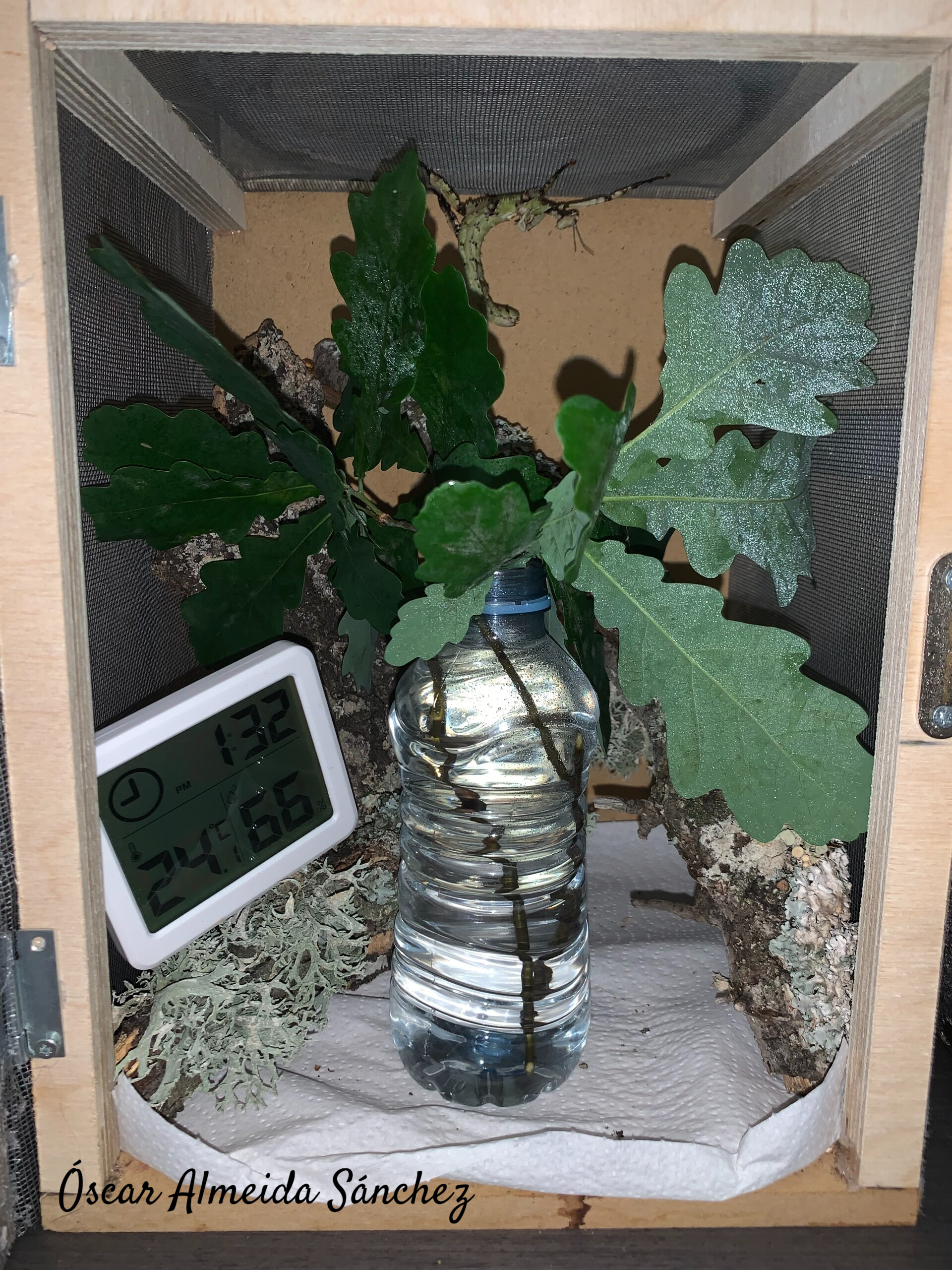 Terrario de Extatosoma tiaratum liquen con temperatura y humedad favorables: temperatura ambiente y humedad entorno al 60-70%