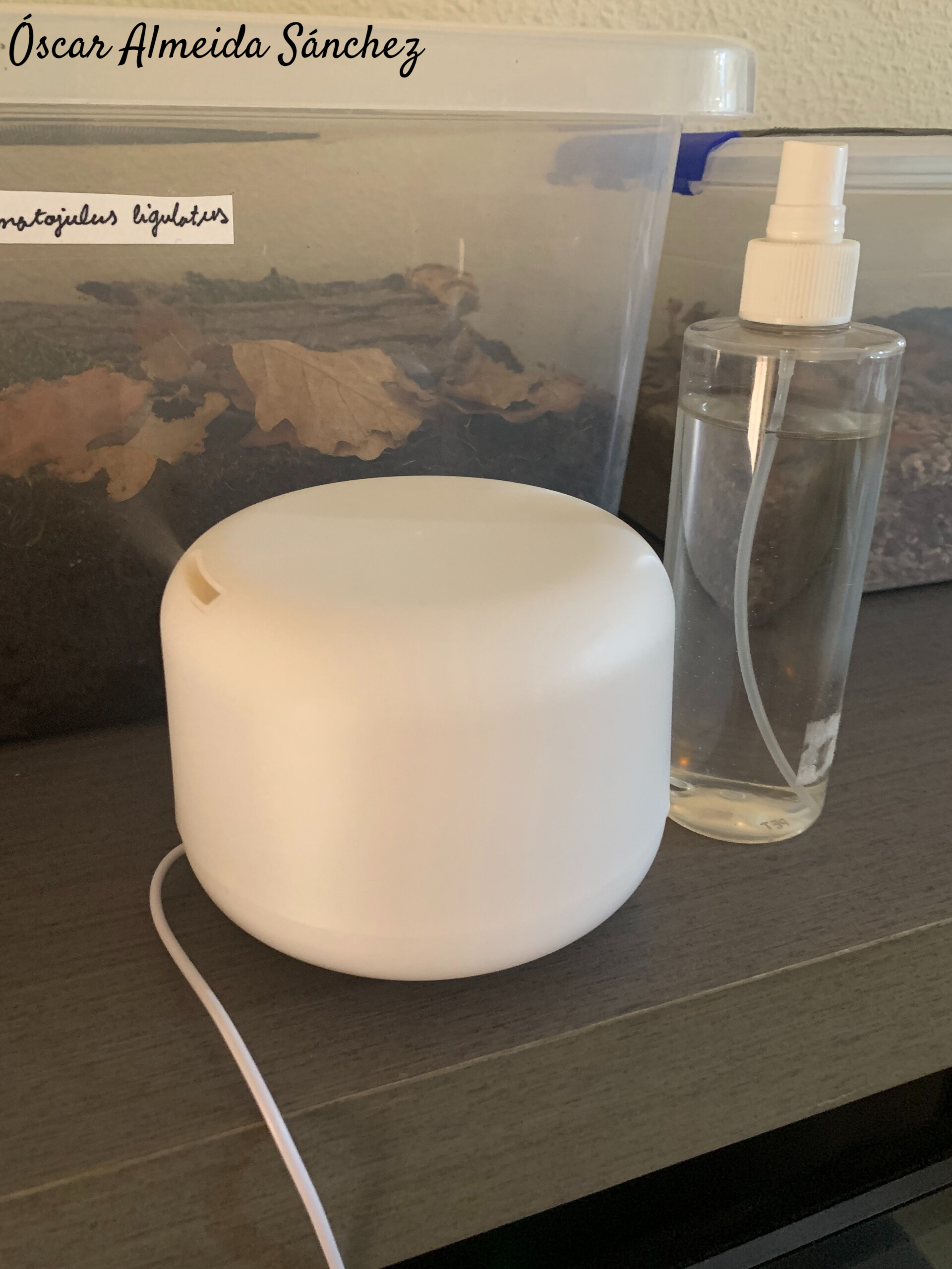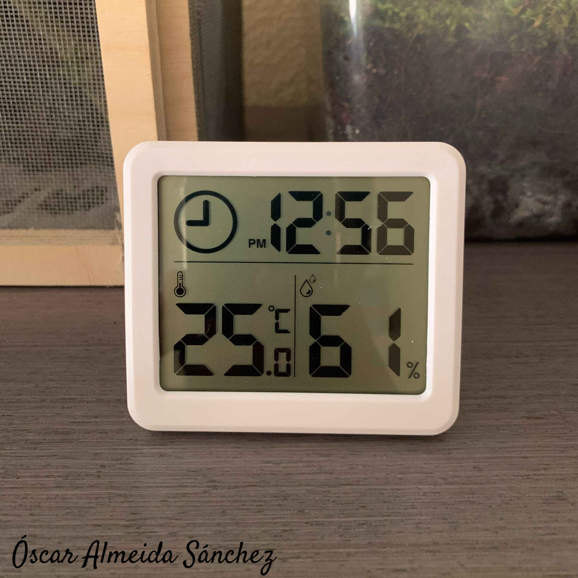 Para controlar tanto la temperatura como la humedad recomiendo un medidor termómetro-higrómetro, así como un humidificador para mantener la humedad constante sobre todo en verano, junto con una o dos pulverizaciones diarias en los terrarios (dependiendo de la zona en la que estemos: si nos encontramos en el norte de España no haría falta humidificador ni pulverizaciones (quizás alguna en verano solamente) ya que allí la zona está cerca del mar, mientras que si nos encontramos en la zona centro sí haría falta un aporte extra de humedad al ser una zona más seca).