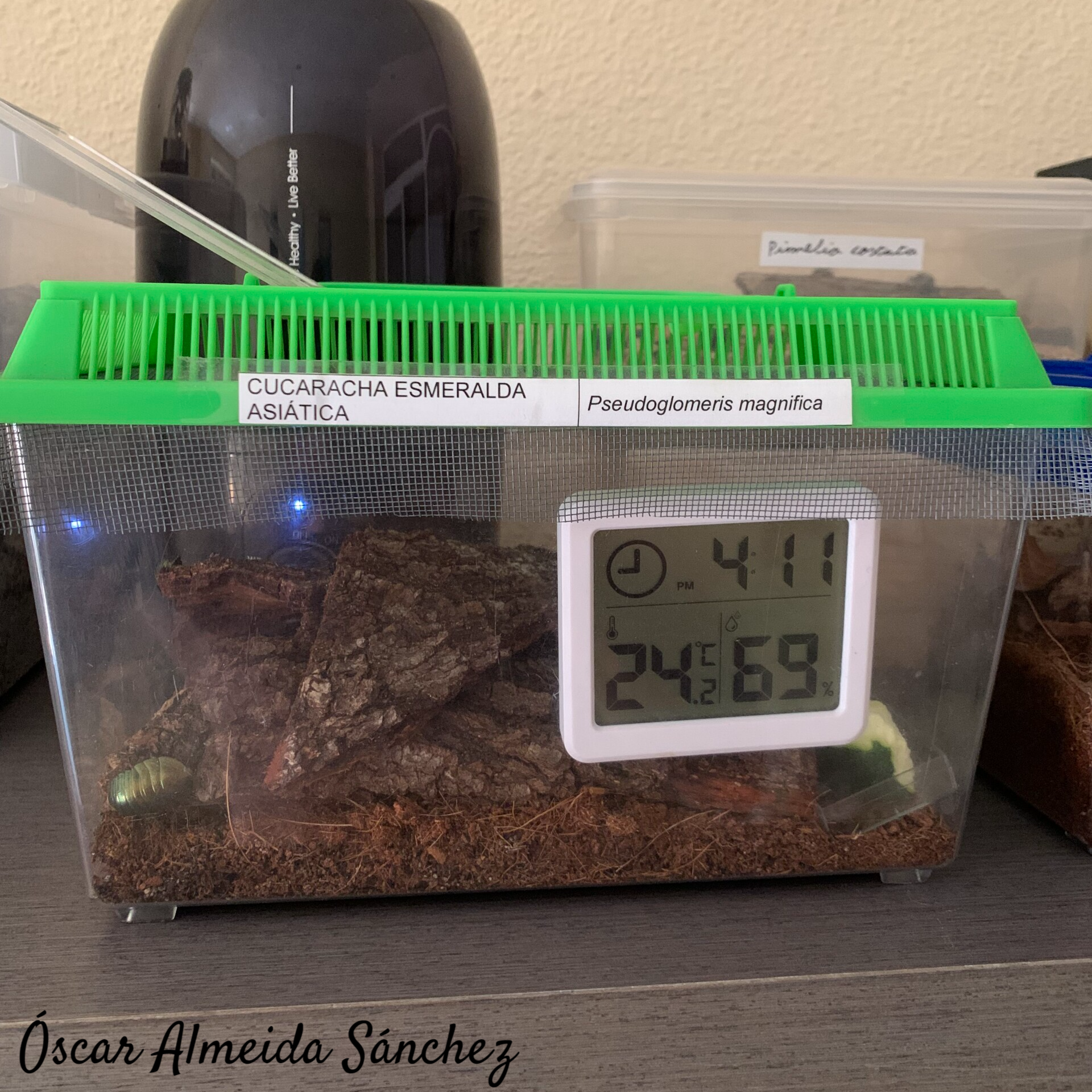 Terrario de Pseudoglomeris magnifica con temperatura y humedad favorables: temperatura ambiente y humedad entorno al 60-70%.