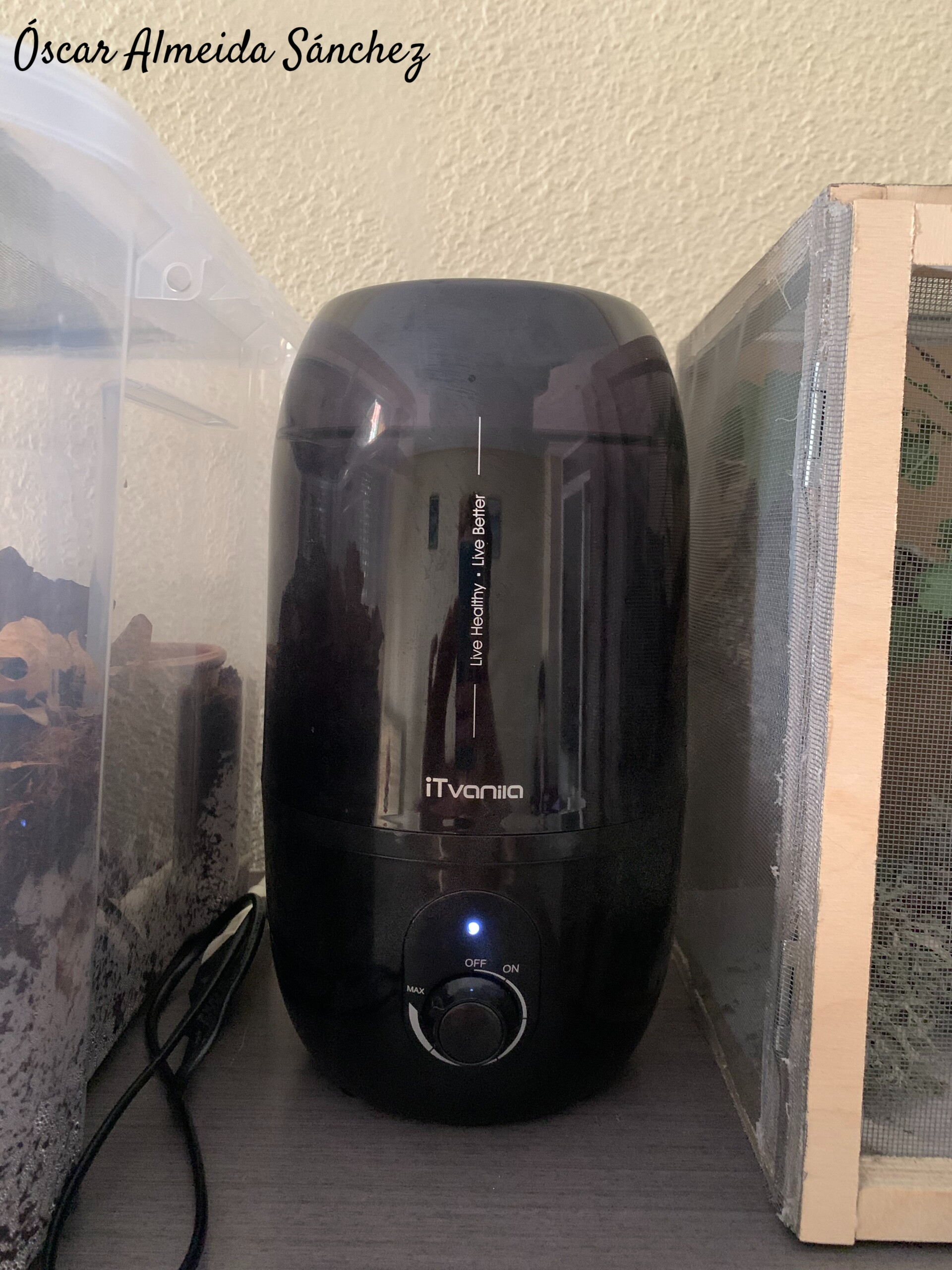 Humidificador de amplio alcance. Preferiblemente para aportar humedad al ambiente de todos los terrarios es muy buena opción. Se puede regular la cantidad de niebla fría que sale de la boquilla. Además de aportar humedad enfría la temperatura. Indispensable para los meses de verano.